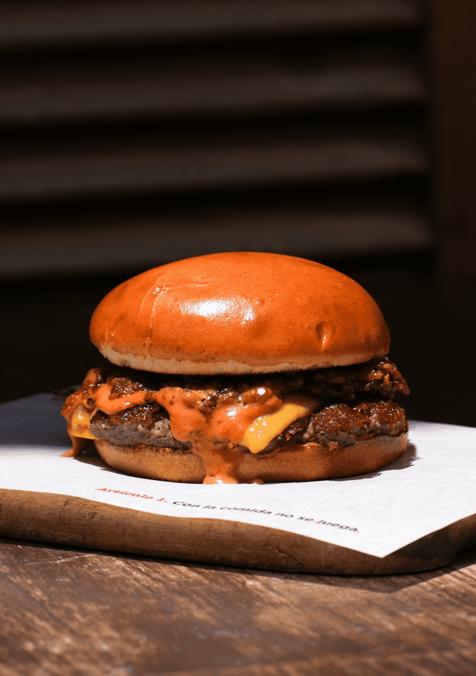 Burger con 160g. de carne fresca 100% vacuno boleado a mano, queso ahumado fundido, mermelada de bacon y mango picante, salsa Mamba Roja casera, cebolla crujiente y nuestro pan brioche.