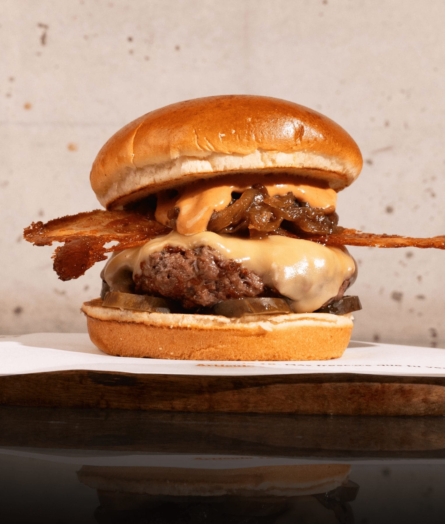 Blend de carne de vaca (aguja y Angus), cebolla caramelizada Bourbon-Bulgog, queso gouda ahumado fundido, bacon crujiente, pepinillos, salsa Verbena y nuestro pan brioche.